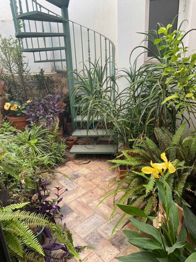 But then we were going away for eleven weeks and I needed a keep the plants watered. On the Saturday and Sunday three weeks before we left, I folded away the table and chairs and gathered all the plants from my three outside spaces to here, the shadiest and coolest of my outdoor spaces. They certainly took up a lot of space. I then spent the mornings on the second to last and last weekends (in mid-June) setting up a watering system on a timer. The first of those four mornings was spent just sitting at my kitchen table, reading the instructions, watching YouTube videos and figuring out how to set up an irrigation system.
