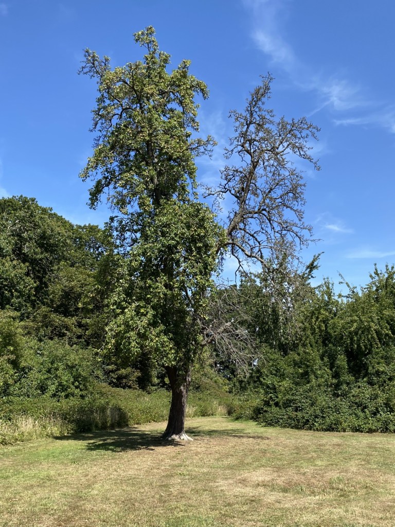 I’m drawn to the perseverance of this pear tree, to its wonky imperfection. Something happened to it – a lighning strike perhaps – that irreparably damaged one half of it, yet the other half carries on steadfast and lively. And I come to see that the damaged part might still have its role to play too, providing balance and stability, helping to anchor the still lively half.